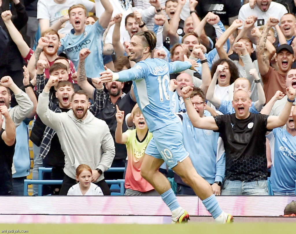صورة التقطت أمس للإنجليزي جاك جريليش يحتفل بباكورة أهدافه مع السيتي خلال الفوز 5ـ0 على نوريتش في الدوري (أسوشيتد برس)