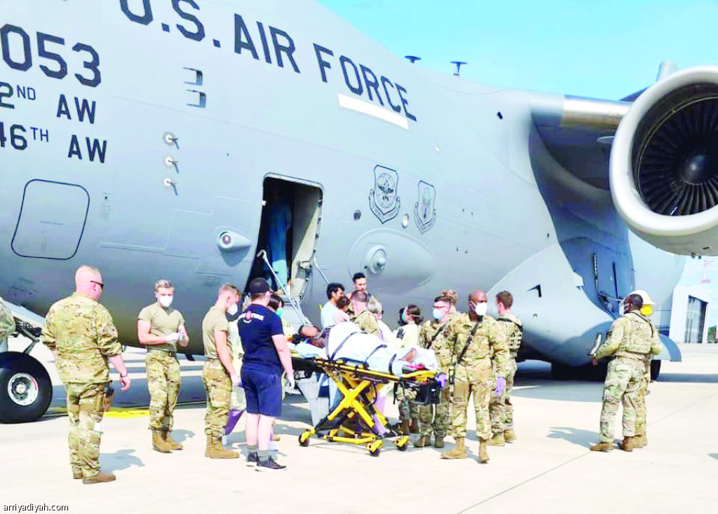 صورة التقطت أمس للسيدة الأفغانية لحظة هبوطها في قاعدة رامشتاين الألمانية بعد توليدها داخل الطائرة (تويتر القيادة الجوية الأمريكية المتنقلة)