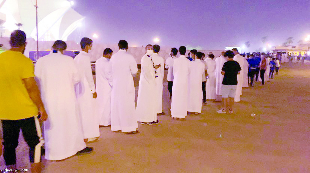صورة التقطت أمس لمشجعين يقفون في طابور داخل منشأة الملعب، أثناء الشوط الأول من مباراة الهلال والباطن، للخضوع إلى الإجراءات التنظيمية قبل إدخالهم إلى المدرجات تصوير: عبد الإله المرحوم