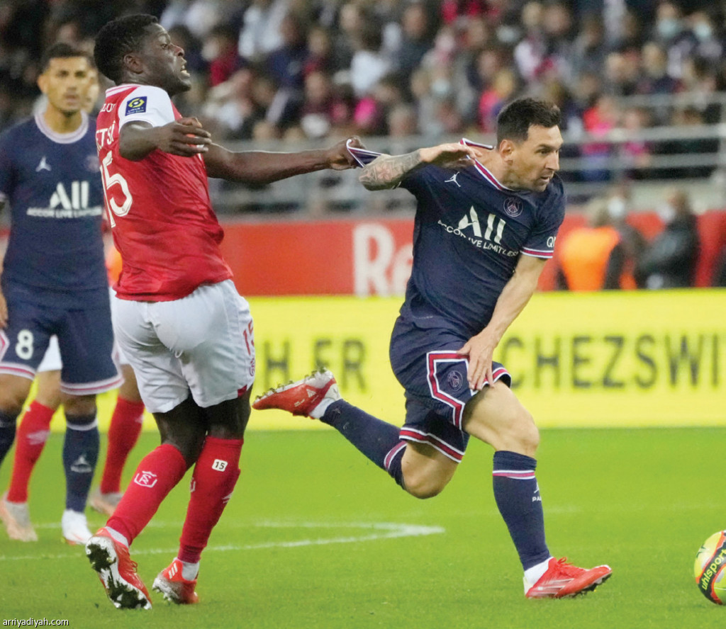 صورة التقطت أمس الأول لميسي، مهاجم باريس سان جيرمان، يتعرض للعرقلة من الزيمبابوي مارشال مونيتسي، لاعب وسط ريمس، خلال مباراة الفريقين (الفرنسية)