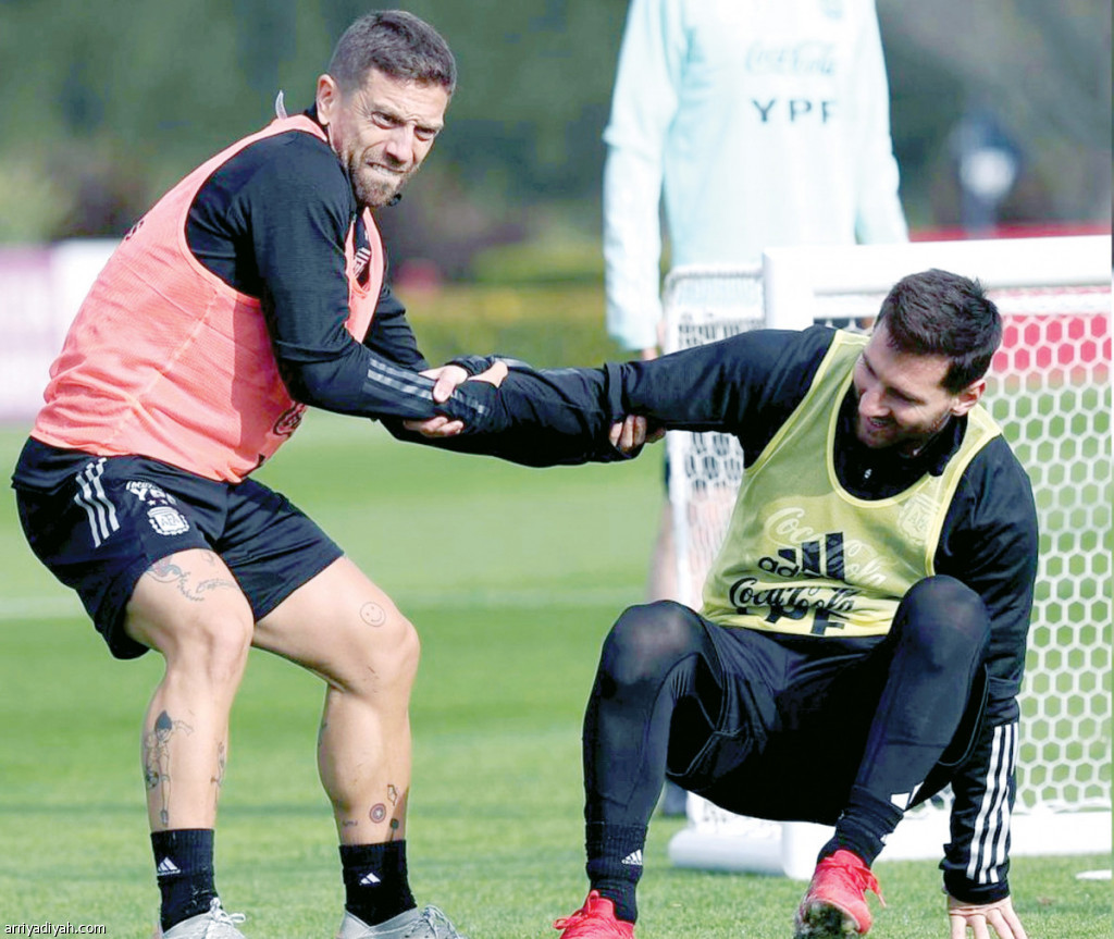 صورة التقطت أمس لميسي وجوميز لاعبي منتخب الأرجنتين خلال التدريبات التحضيرية لمواجهة بوليفيا الجمعة المقبل ضمن تصفيات المونديال (المركز الإعلامي ـ الأرجنتين)