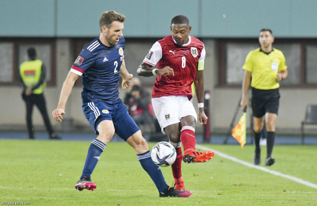 صورة التقطت أمس الأول لديفيد ألابا لاعب منتخب النمسا وستيفن أودونيل لاعب منتخب إسكتلندا يتنافسان على الكرة (الفرنسية)