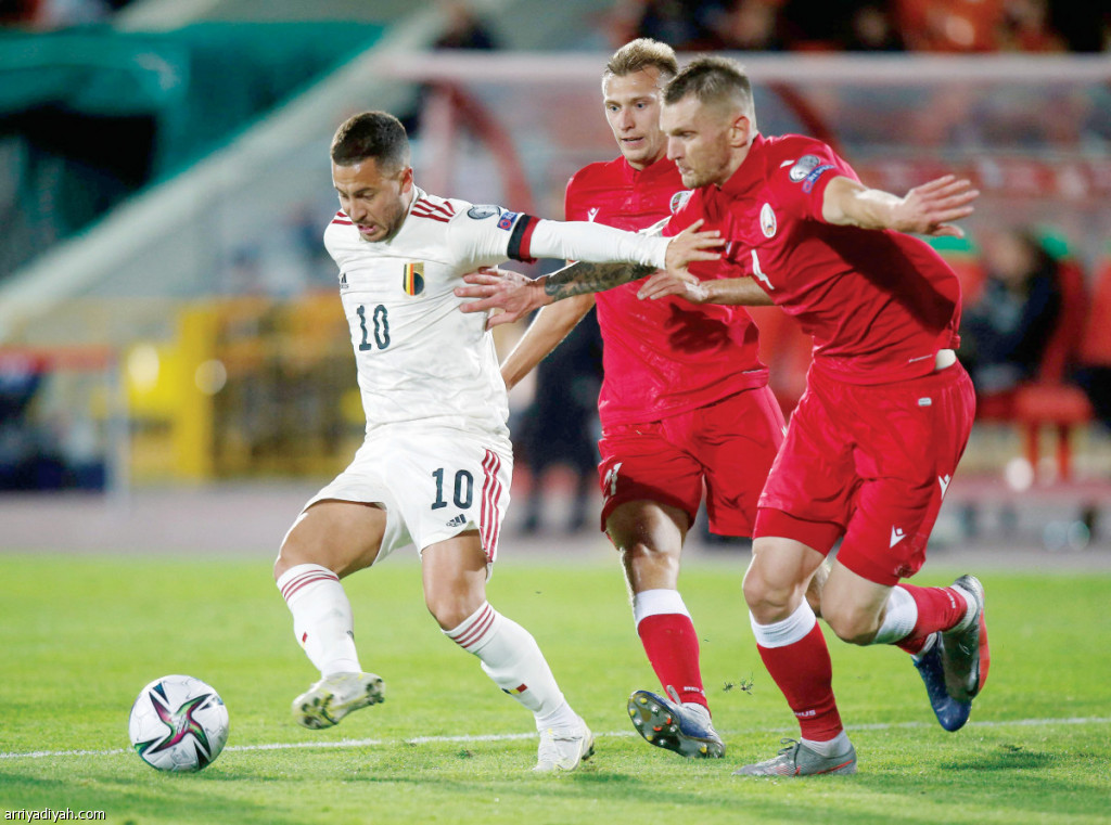 صورة التقطت أمس الأول لهازارد لاعب منتخب بلجيكا ينطلق بالكرة وسط ملاحقة كليموفيتش ورحمانوف لاعبي بيلاروسيا (الألمانية)