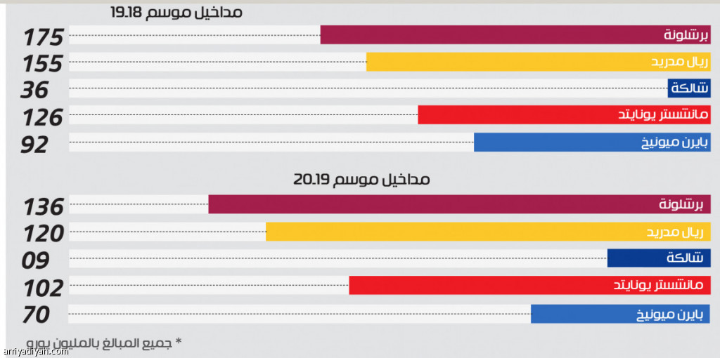 ففي إحصائية صادرة من موقع “كي بي إم جي” الشهير، انخفضت مداخيل نادي برشلونة الإسباني بمقدار 39 في المئة، من 175 مليونًا موسم 2018ـ2019 إلى 136 مليونًا موسم 2019ـ2020، ليكون أكثر المتضررين.