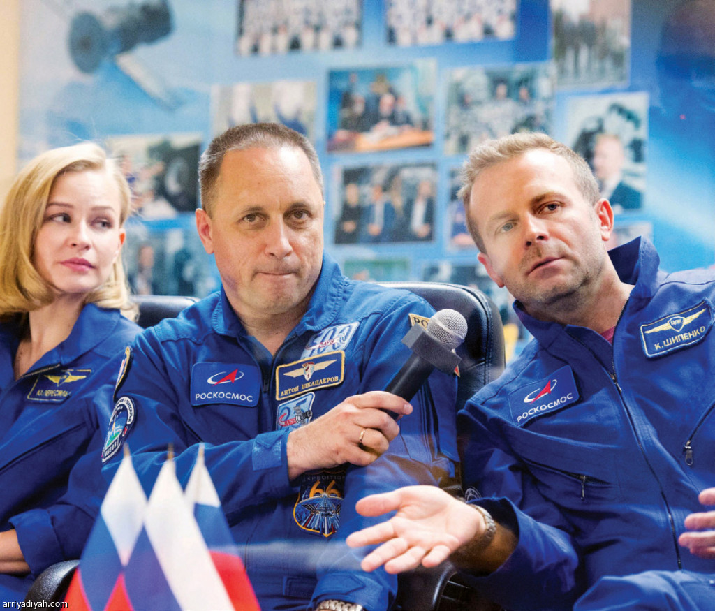 صورة التقطت أمس لأنطون شكابلروف رائد الفضاء ويوليا بيريسيلد الممثلة وكليم شيبينكو المخرج السينمائي خلال المؤتمر الصحفي للرحلة ( الفرنسية)