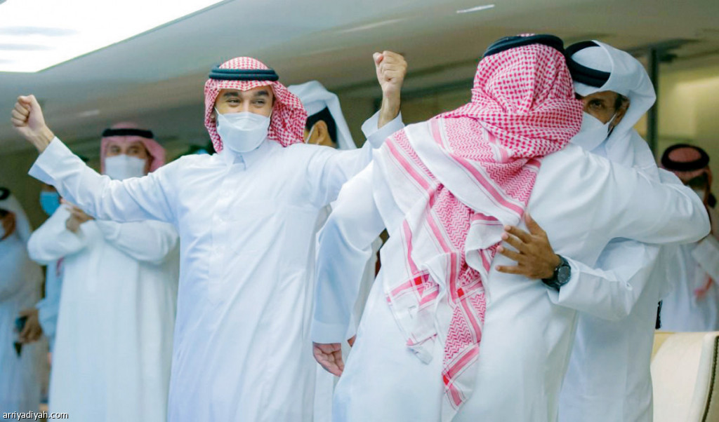 صورة التقطت أمس لعبد العزيز بن تركي الفيصل، وزير الرياضة، يحتفي بفوز الأخضر بعد إطلاق الحكم صافرته معلنًا نهاية المباراة