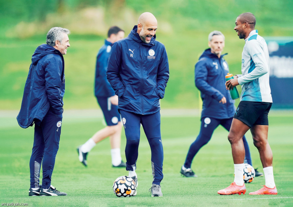 صورة التقطت أمس للبرازيلي فرناندينيو، لاعب وسط مانشستر سيتي، في حوار مع الإسباني بيب جوارديولا، المدرب، خلال الحصة التدريبية للفريق (المركز الإعلامي ـ مانشستر سيتي)