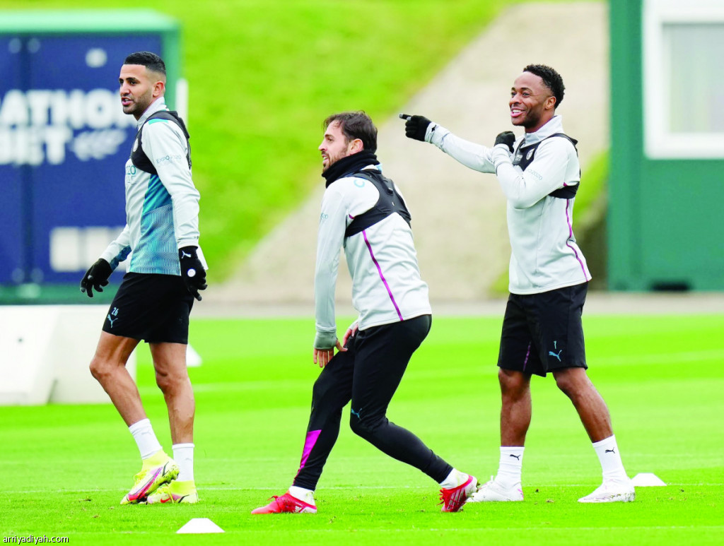 صورة التقطت أمس لرحيم ستيرلينج، المهاجم، والبرتغالي بيرناردو سيلفا، لاعب الوسط، والجزائري رياض محرز، المهاجم، خلال الحصة التدريبية لفريق مانشستر سيتي (المركز الإعلامي ـ السيتي)