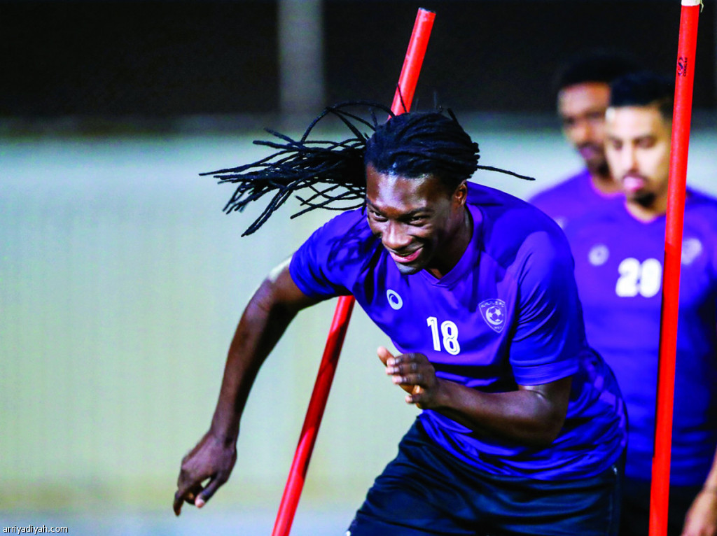 الفرنسي بافيتمبي جوميز لاعب الهلال خلال التمرين الأخير لفريقه استعدادا لمواجهة بيرسبوليس الإيراني على ملعب فيصل بن فهد في الرياض..