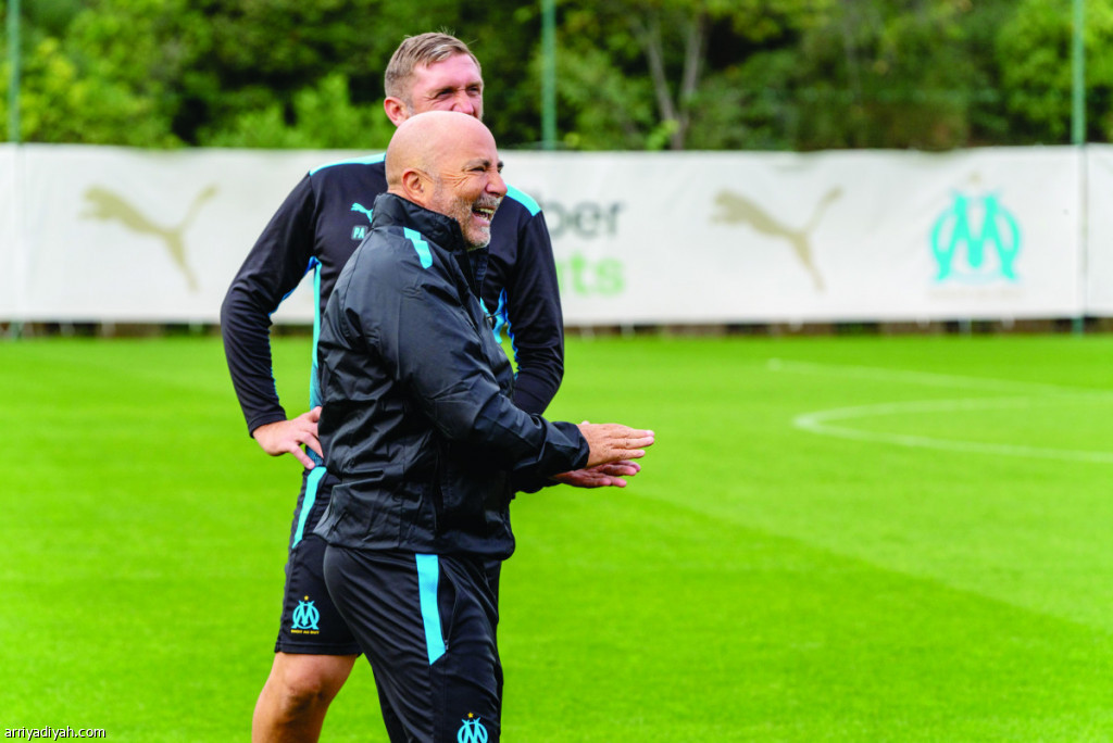 صورة التقطت أمس للأرجنتيني خورجي سامباولي، مدرب فريق مرسيليا، يتابع لاعبيه خلال الحصة التدريبية (المركز الإعلامي - مرسيليا)