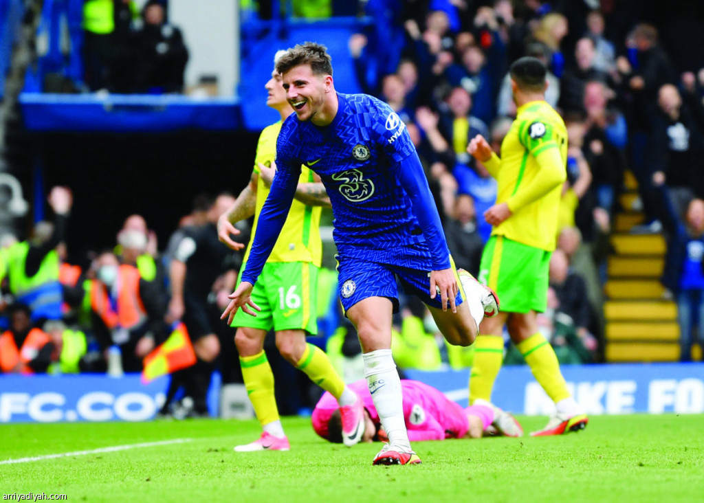 صورة التقطت أمس لماونت، لاعب تشيلسي، ينطلق فرحًا بعد تسجيله هدفًا في شباك نورويتش (رويترز)