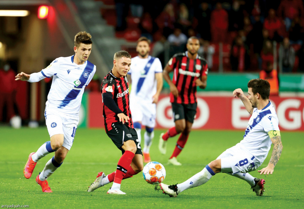 صورة التقطت، أمس الأول، فيرتز لاعب باير ليفركوزن، وجوندورف لاعب كارلسروه، يتنافسان على الكرة وسط متابعة وانيتزيك خلال المباراة التي جمعت الفريقين في كأس ألمانيا وانتهت بخسارة ليفركوزن 1ـ2 (الفرنسية)