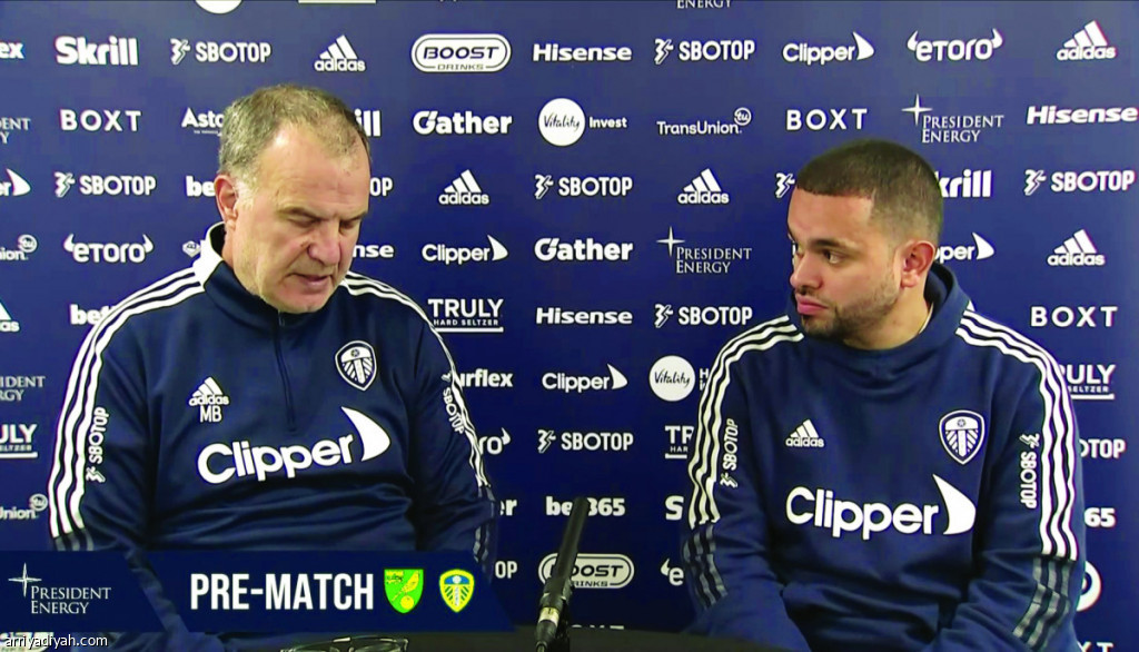 صورة التقطت أمس لبيلسا، مدرب فريق ليدز يونايتد الإنجليزي، خلال المؤتمر الصحافي لفريقه قبل مواجهة نورويتش سيتي غدًا (المركز الإعلامي ـ ليدز يونايند)
