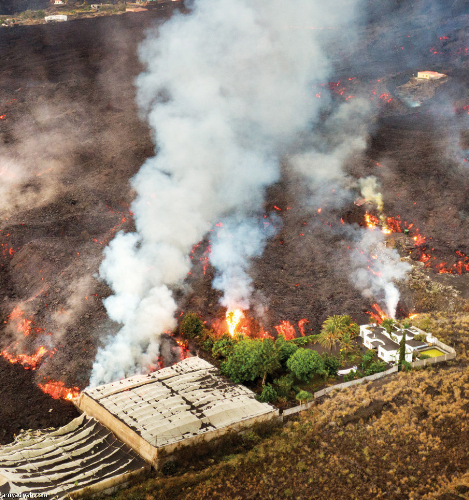 صورة التقطت أمس لحمم بركانية تدمِّر المنازل ومزارع الموز في جزيرة لا بالما الإسبانية (أسوشيتد برس)