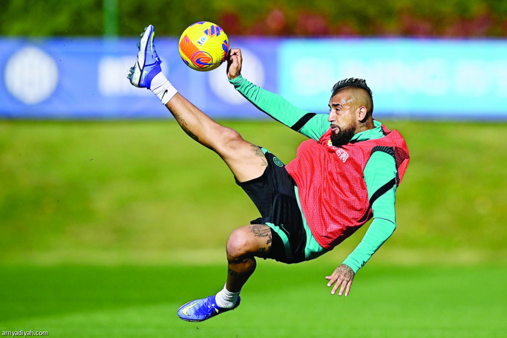 صورة التقطت أمس للتشيلي أرتورو فيدال، لاعب وسط إنتر ميلان الإيطالي، يسدد كرة خلفية مزدوجة أثناء تدريبات الفريق استعدادًا لمباراة ميلان غدًا(المركز الإعلامي ـ إنتر ميلان)