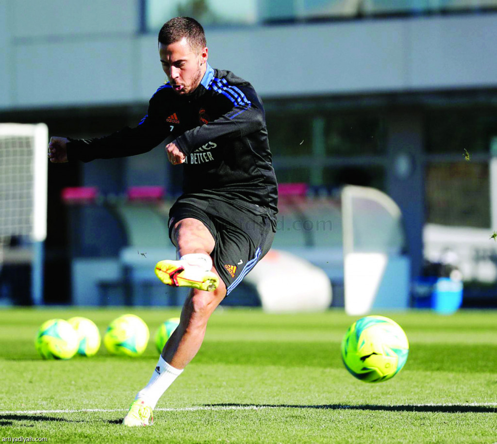 صورة التقطت أمس للبلجيكي إيدين هازارد، مهاجم ريال مدريد، يسدد الكرة أثناء تدريبات الفريق (المركز الإعلامي ـ ريال مدريد)