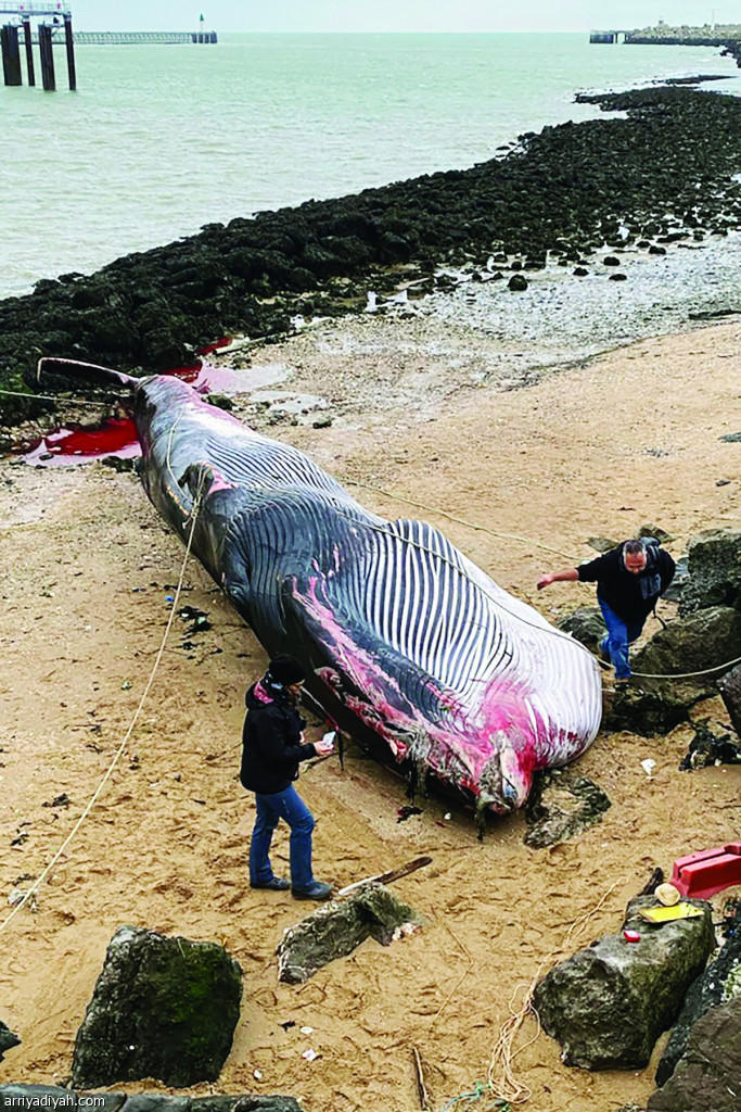 صورة التقطت أمس لأنثى الحوت على شاطئ ميناء كاليه الفرنسي(الفرنسية)