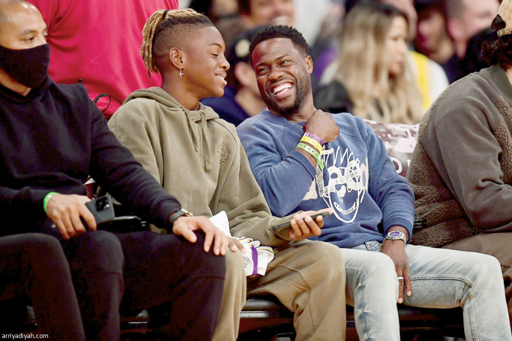 تابع كيفن هارت، الممثل الكوميدي الأمريكي، مباراة فريقي لوس أنجليس ليكرز وتشارلوت هورينتس في دوري السلة الأمريكي للمحترفين.. وفي الصورة هارت وهندريكس، ابنه، في حديث جانبي خلال الشوط الثاني من المباراة التي جرت في مركز سابليس في لوس أنجليس (رويترز)