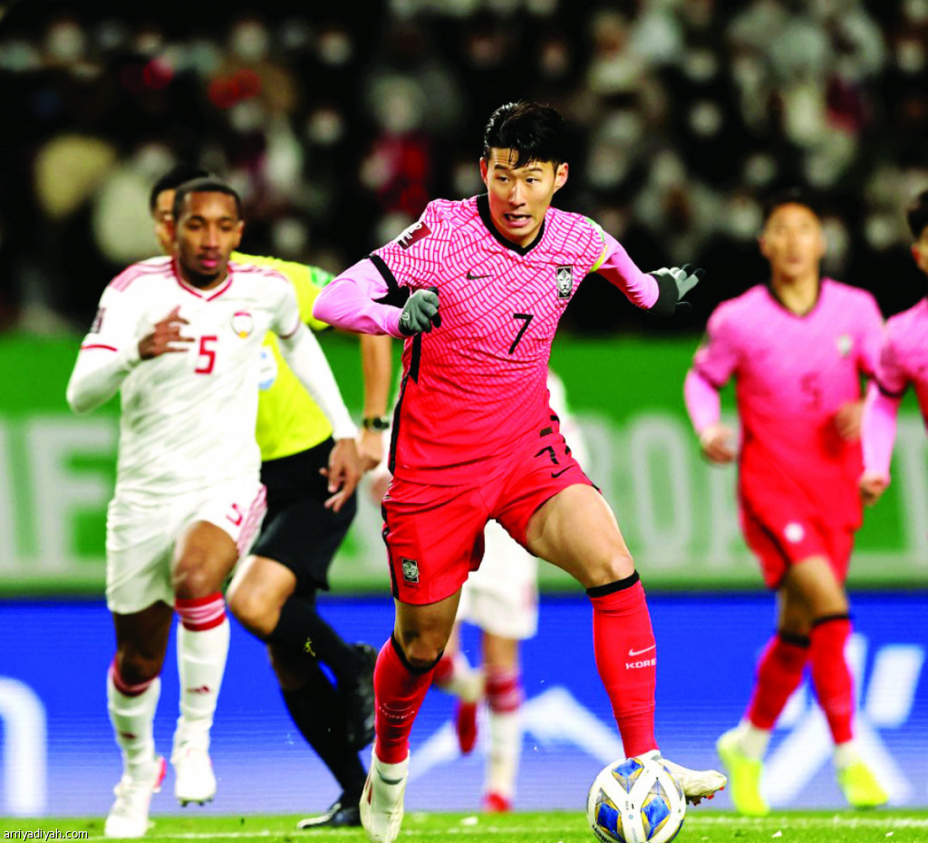 صورة التقطت أمس لسون هيونج مين، مهاجم كوريا، يتقدم بالكرة تحت ضغط من علي سالمين، لاعب وسط الإمارات (المركز الإعلامي - اتحاد القدم الآسيوي)