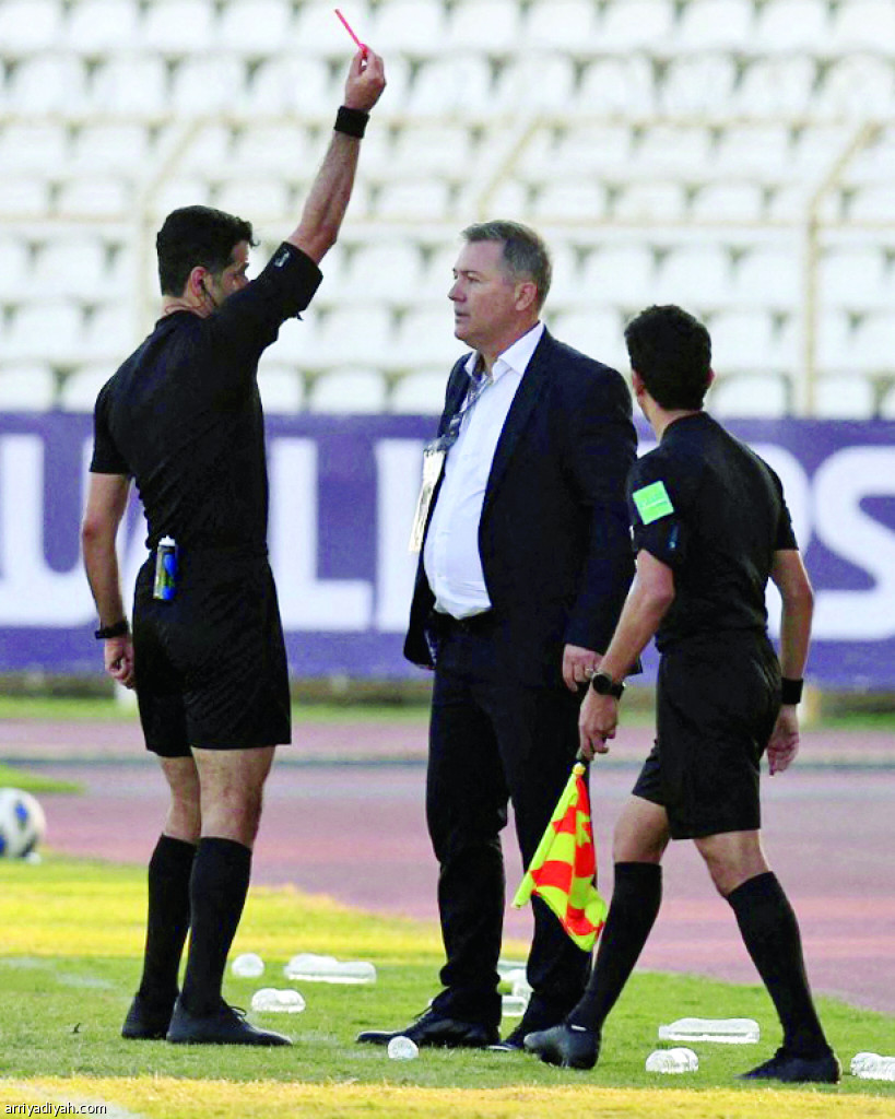 صورة التقطت أمس للقطري عبد الرحمن الجاسم، الحكم، يطرد الكرواتي دراجان سكوتشيتش، مدرب إيران، لارتكابه مخالفة أثناء الاحتفال بهدف التعادل أمام لبنان (الفرنسية)