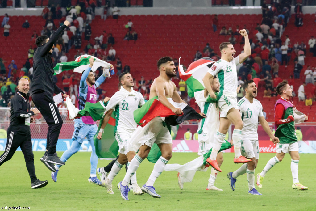 صورة التقطت أمس للاعبي المنتخب الجزائري الأول لكرة القدم يحتفلون بالتأهل إلى نصف نهائي كأس العرب بعد تجاوز المنتخب المغربي بركلات الترجيح(الفرنسية)