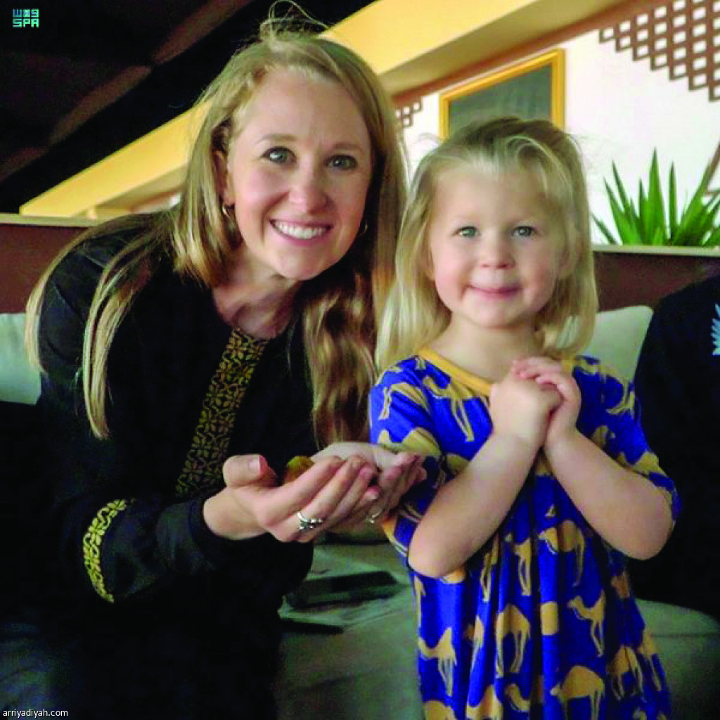 صورة التقطت أمس الأول لسائحة أجنبية مع طفلتها أثناء زيارتها لسوق الدهناء ومهرجان الملك عبد العزيز للإبل