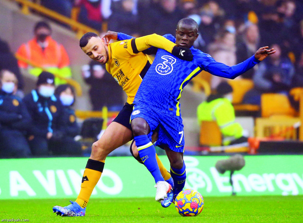 صورة التقطت أمس الأول لكانتي، لاعب تشيلسي، ورومان، لاعب وولفرهامبتون، يتنافسان على الكرة في المباراة التي جمعت الفريقين في الدوري (رويترز)