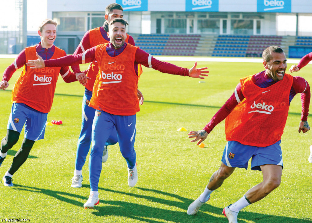 صورة التقطت أمس لألفيس وألبا ودي يونج وأراوخو، لاعبي برشلونة، أثناء التدريبات (المركز الإعلامي ـ برشلونة)