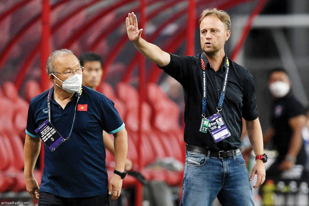 صورة التقطت أمس لألكسندر بولكينج، مدرب تايلاند، إلى جانب بارك هانج سيو، مدرب فيتنام، خلال المباراة التي جرت في سنغافورة(الفرنسية)