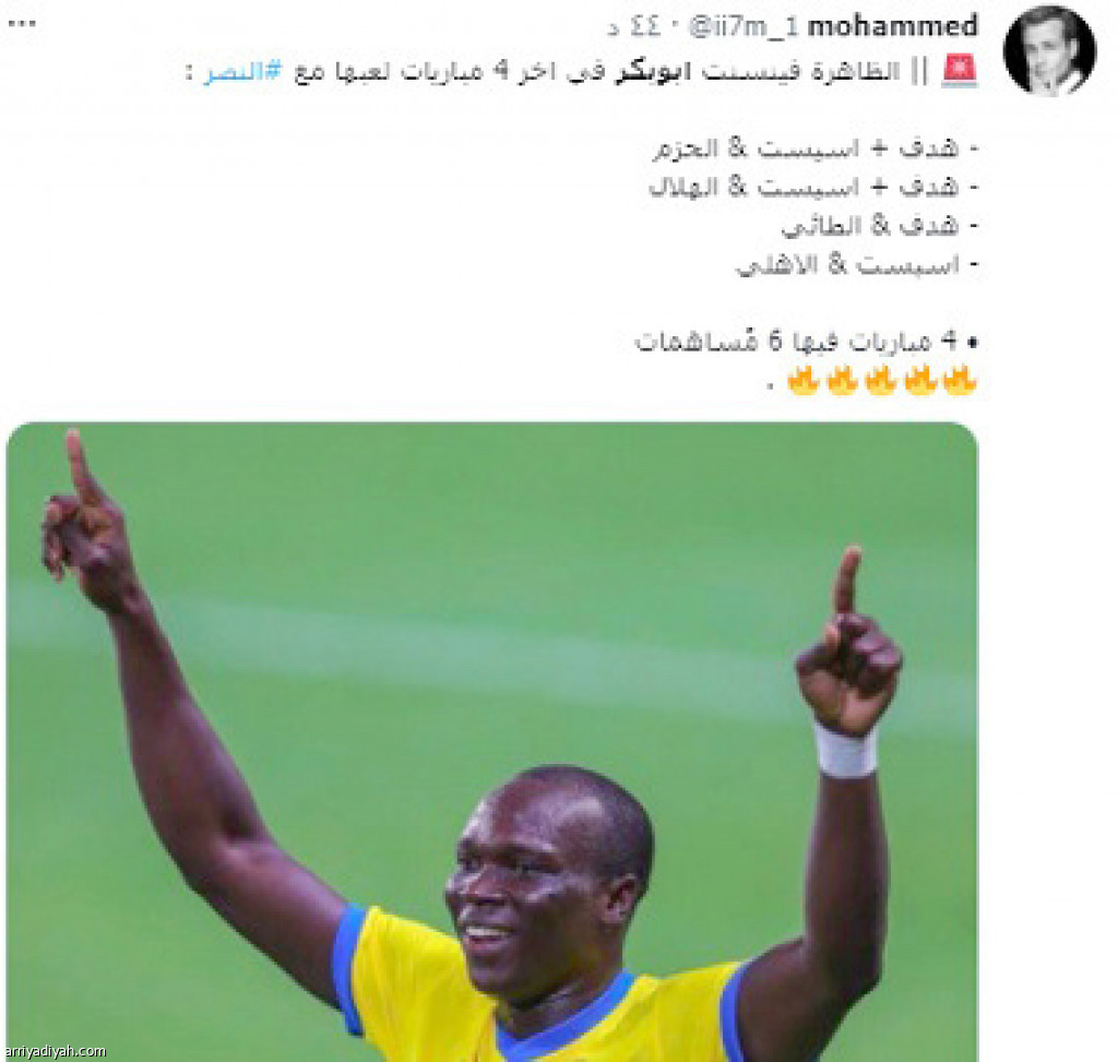 تصدر الكاميروني فينسنت أبو بكر، مهاجم فريق النصر الأول لكرة القدم، تفاعل #النصر_الحزم في موقع التواصل الاجتماعي “تويتر”، من خلال الهاشتاق الذي يحمل اسمه، وصعد إلى الترند بـ 16 ألف تغريدة.