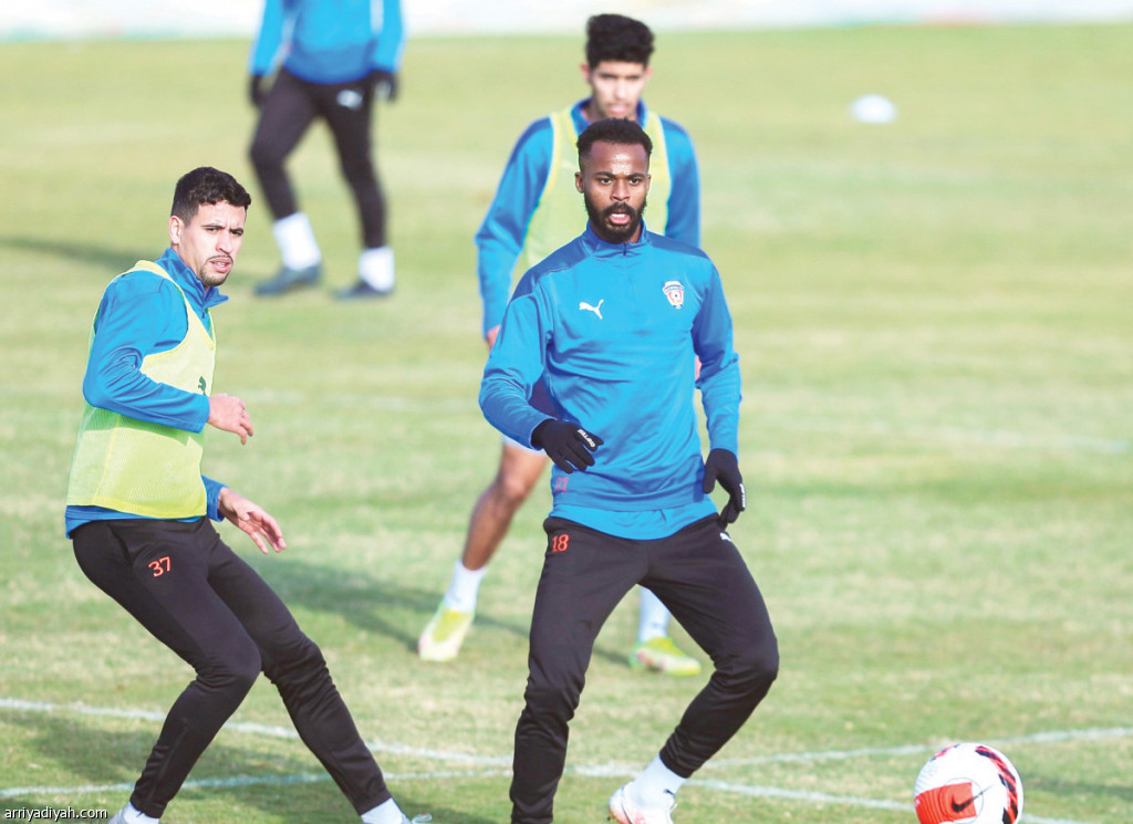 صورة التقطت أمس لرايلر لاعب الفيحاء يمرر الكرة وسط ترقب البركة زميله أثناء التدريبات (المركز الإعلامي - الفيحاء)