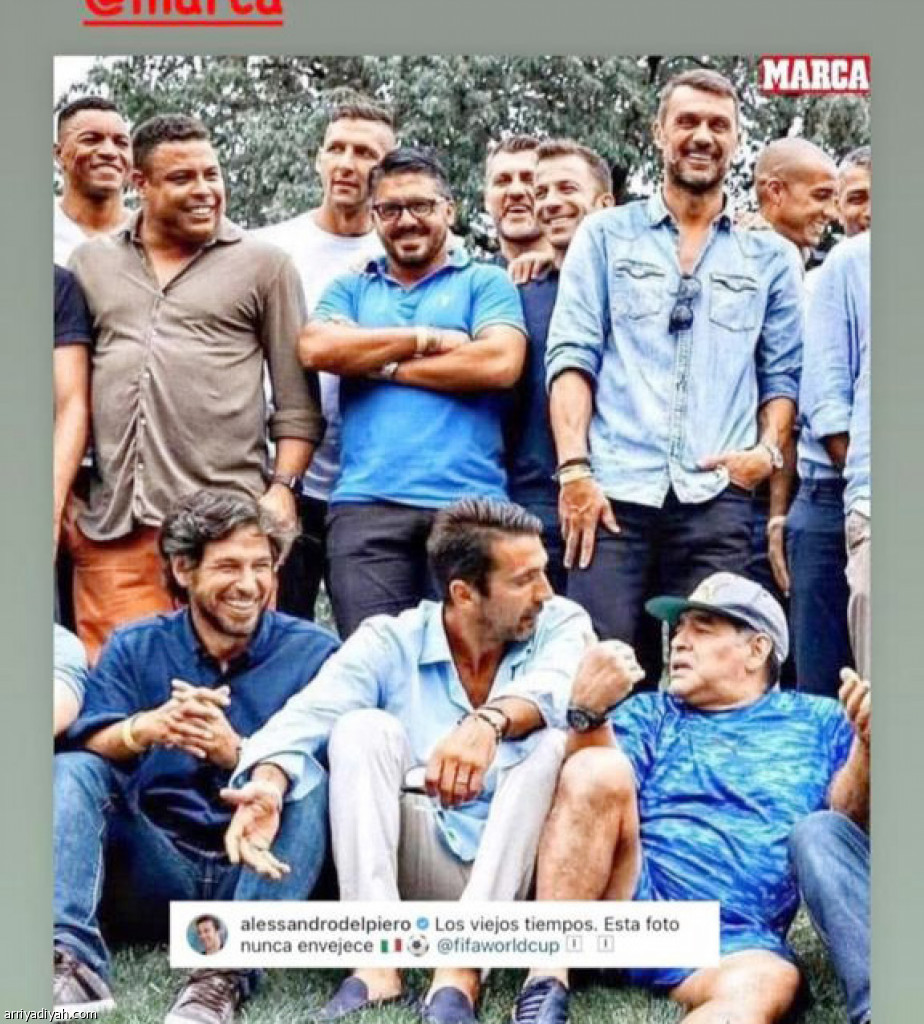 نشر الإيطالي أليساندرو ديل بيرو مهاجم يوفنتوس السابق صورة على حسابه في فيسبوك جمعته بقدامى النجوم الذين يعدون من أساطير الملاعب الإيطالية. ومن بين اللاعبين مارادونا وجينالوجي بوفون وباولو مالديني ورونالدو الظاهرة.