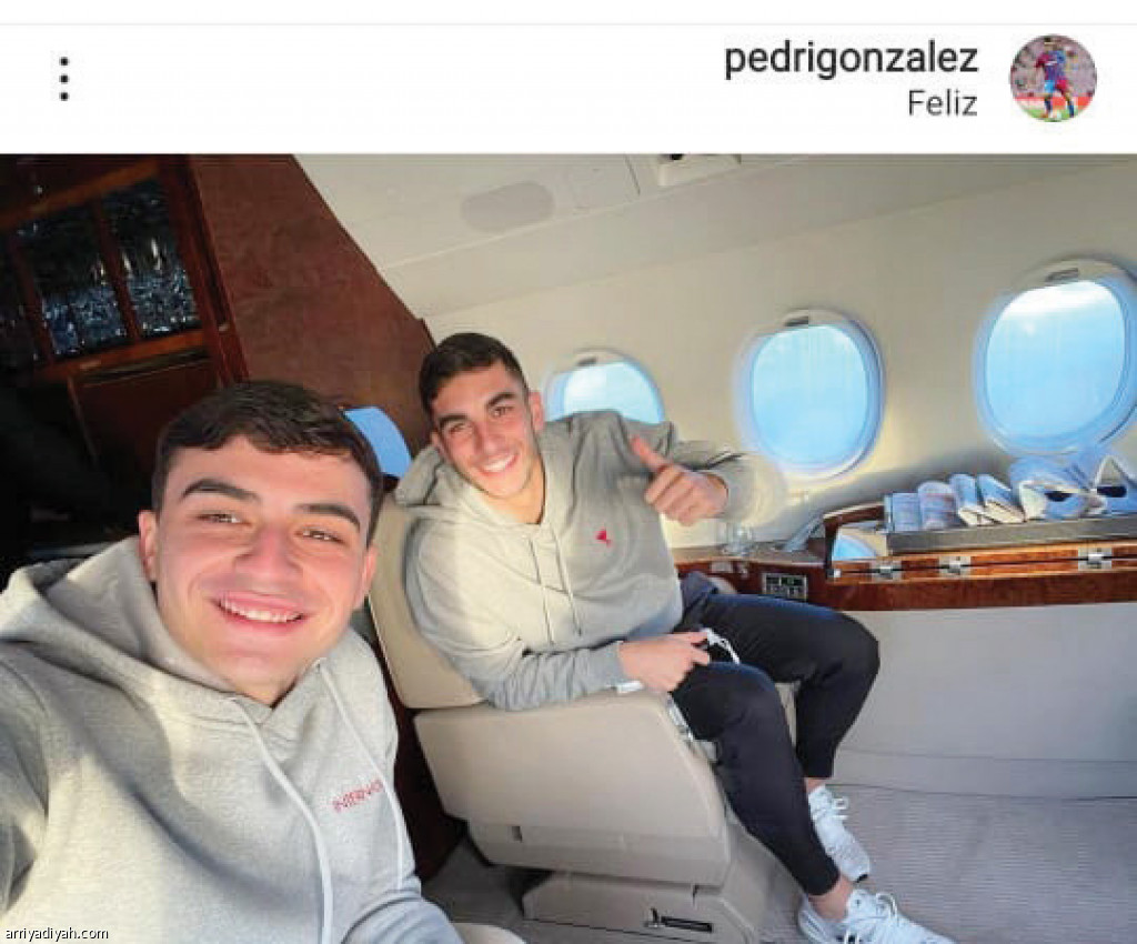 بث الإسباني بيدري، لاعب فريق برشلونة، عبر منصاته، صورة “سيلفي” مع فيران توريس، زميله، وهما في الطائرة متجهان إلى الرياض للانضمام إلى الفريق.