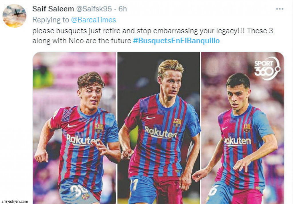 صعد وسم #BusquetsEnElBanquillo أو #بوسكيتس على الدكة، الذي أطلقه مغردون إسبان، إلى الترند أمس بـ 50 ألف تغريدة، وشهد مشاركة واسعة من حسابات عربية.