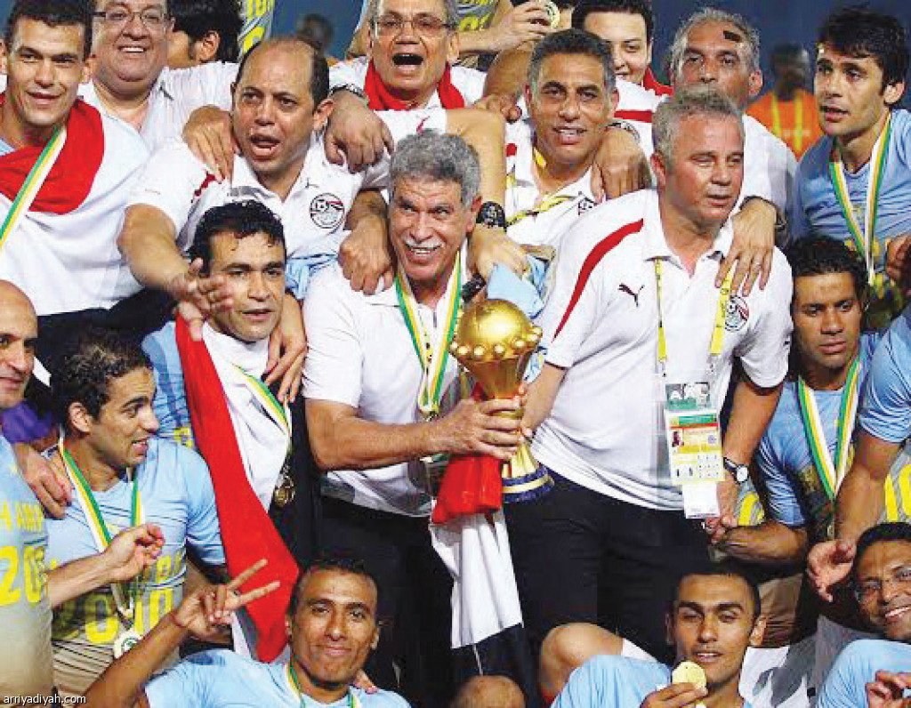صورة التقطت لحسن شحاتة مدرب منتخب مصر الأسبق يحمل كأس إفريقيا 2010 وسط لاعبي المنتخب المصري(أرشيفية)