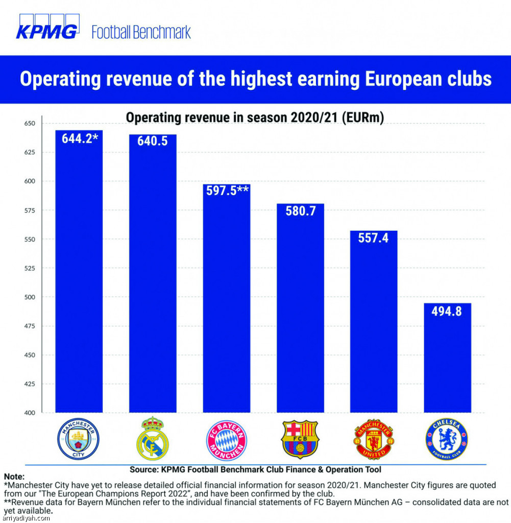 أظهرت دراسة أعدتها الشركة المتخصصة “كي بي إم جي” أن نادي مانشستر سيتي الإنجليزي حقق رقمًا جديدًا كأعلى أندية أوروبا إيرادات خلال الموسم الماضي “20ـ21”، بنحو 644.2 مليون يورو، ليتخطى جميع الأندية الأوروبية بهذا الرقم غير المسبوق.
