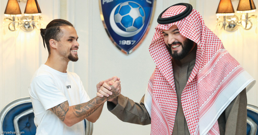 صورة التقطت أمس لفهد بن نافل رئيس نادي الهلال يمسك بقبضة البرازيلي ميشيل المحترف الجديد في صفوف الفريق الأول لكرة القدم يتجاذب معه أطراف الحديث بعد تقديمه رسميًا (المركز الإعلامي ـ الهلال)