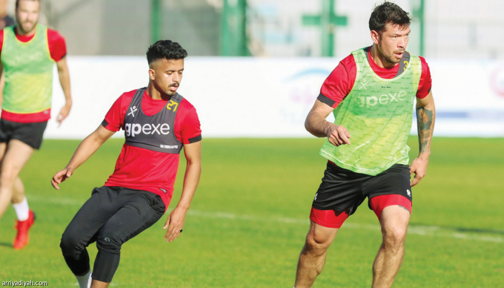 صورة التقطت أمس للأرجنتيني سيرجيو فيتور لاعب ضمك يتقدم بالكرة وسط ترقب وليد حزام زميله أثناء التدريبات (المركز الإعلامي ـ ضمك)