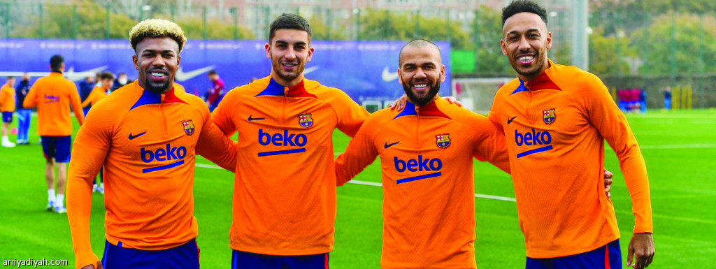 صورة التقطت أمس لأوباميانج وداني ألفيس وفيران توريس وأداما تراوري لاعبي برشلونة خلال الحصة التدريبية (المركز الإعلامي - برشلونة)