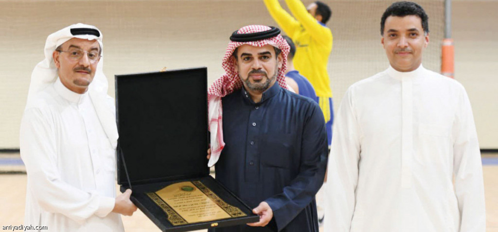صورة التقطت أمس لاثنين من إداريي فريق السلام لكرة السلة يقدمان درعًا تذكارية لبندر الرشود إداري فريق النصر (المركز الإعلامي - السلام)