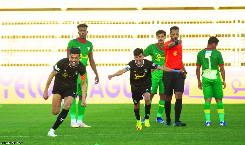 صورة التقطت أمس من فرحة لاعبي فريق الشعلة عقب الفوز على نجران بهدفين مقابل هدف (المركز الإعلامي ـ دوري يلو)