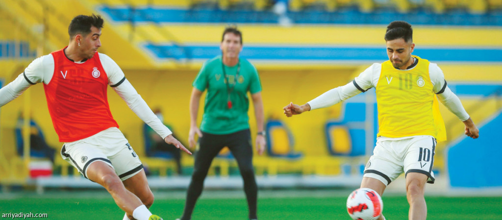 صورة التقطت أمس للأرجنتيني بيتي مارتينيز، جناح النصر، يمرر الكرة في مناورة خلال تدريب الفريق، على ملعبه في الرياض، تحت ضغط مواطنه فونيس موري، المدافع (المركز الإعلامي- النصر)