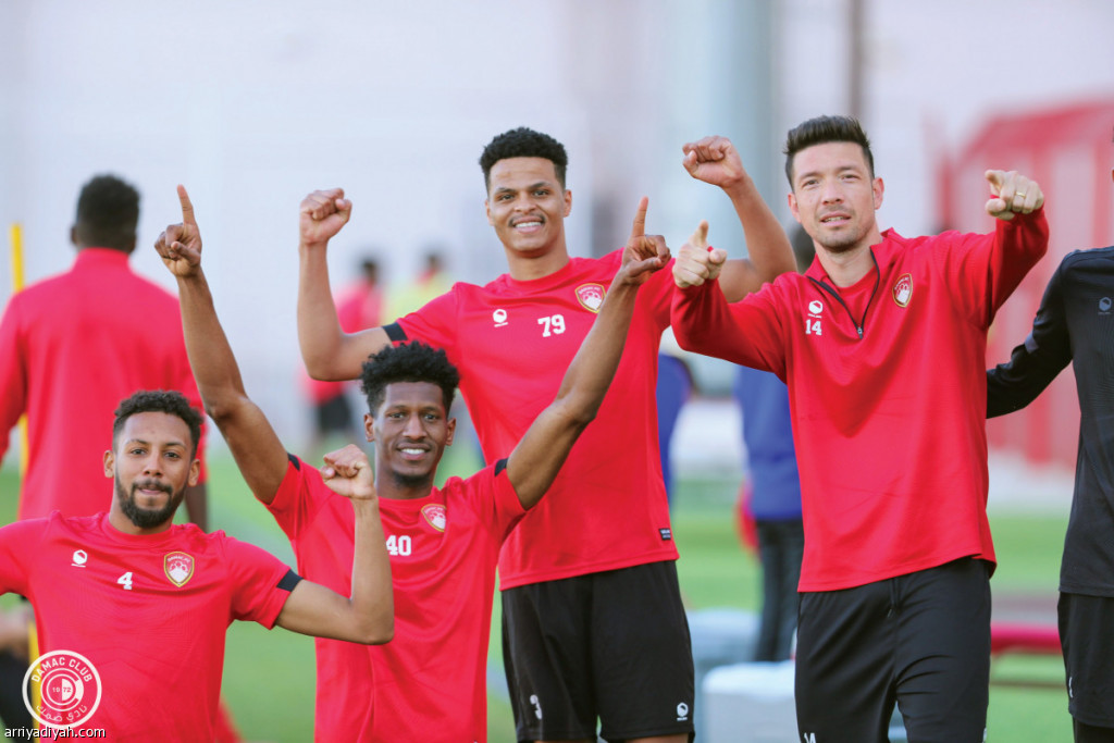 صورة التقطت أمس من تدريبات فريق ضمك الأول لكرة القدم.. يظهر فيها الأرجنتيني سيرجيو فيتور والدبيش(المركز الإعلامي - ضمك)