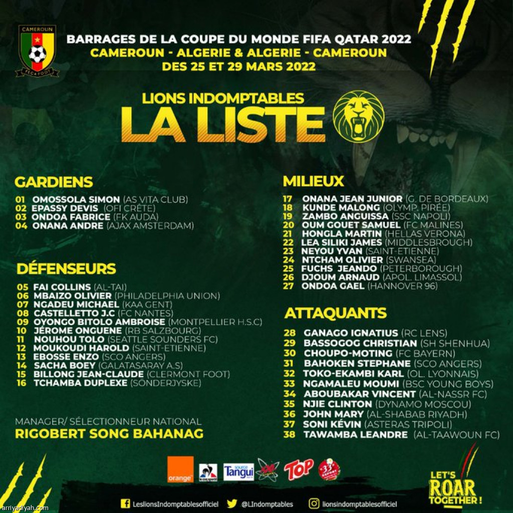 وأعلن منتخب الكاميرون الأول لكرة القدم بقيادة مدربه الوطني الجديد ريجوبير سونج عن القائمة الأولية لمنتخب الأسود غير المروضة التي ستخوض المرحلة النهائية لتصفيات كأس العالم 2022 ضد الجزائر، بنظام مباراتي الذهاب والإياب خلال شهر مارس الجاري.
