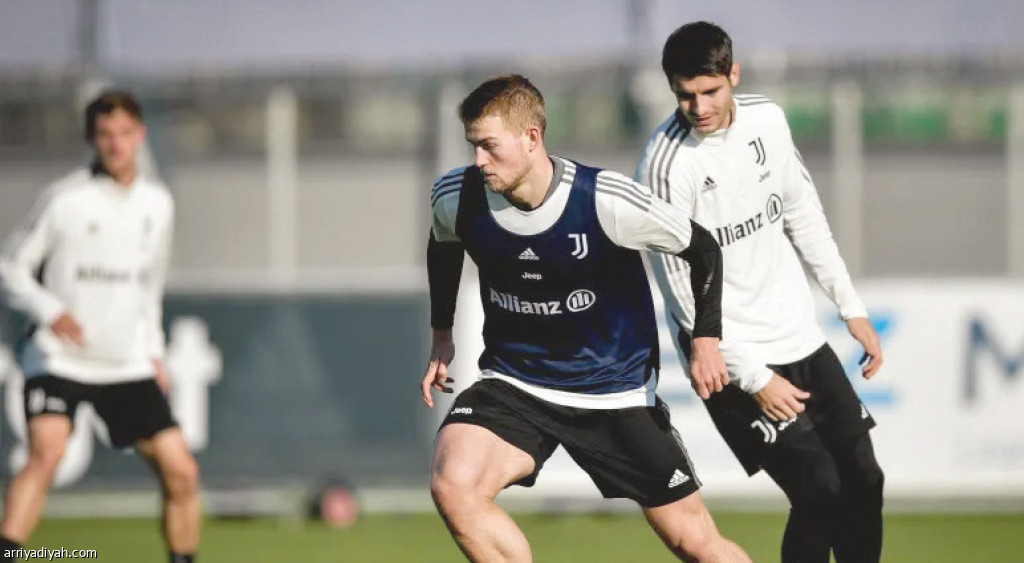 صورة التقطت أمس الأول للهولندي ماتياس دي ليخت، قلب الدفاع، يمر بالكرة من الإسباني ألفارو موراتا خلال تدريبات يوفنتوس (المركز الإعلامي - يوفنتوس)