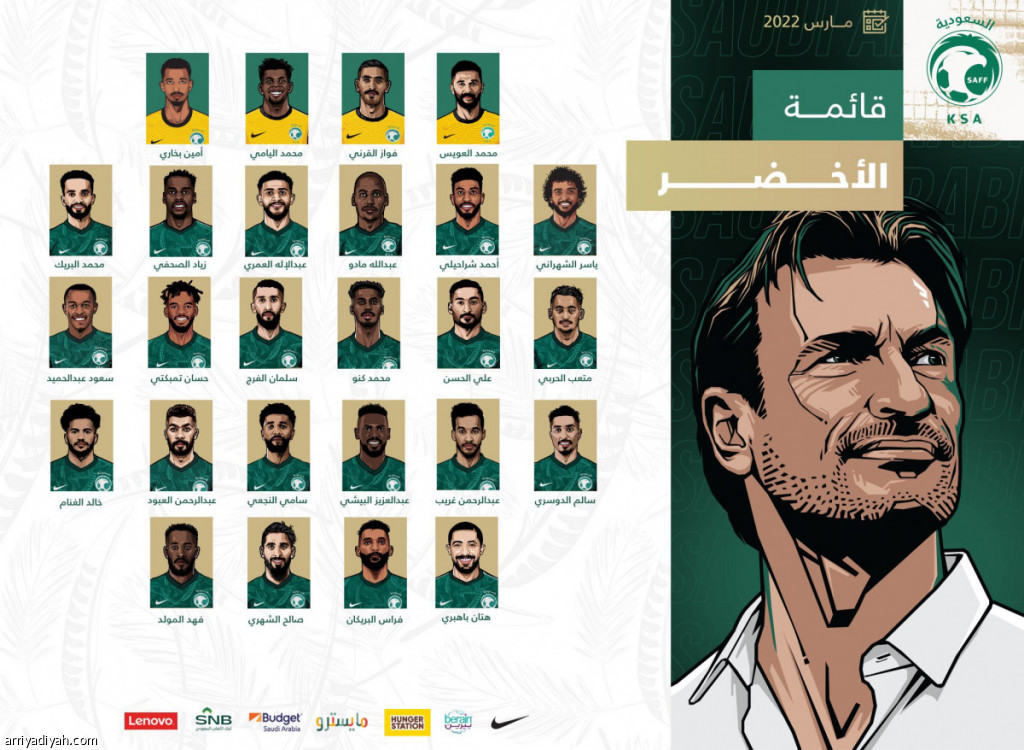 استدعى الفرنسي هيرفي رينارد، مدرب المنتخب السعودي الأول لكرة القدم، 26 لاعبًا لخوض مباراتي الصين وأستراليا، في 24 و29 مارس الجاري، ضمن تصفيات آسيا النهائية المؤهلة إلى كأس العالم.