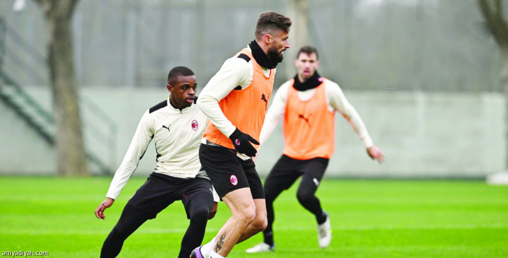 صورة التقطت أمس الأول للفرنسي أولفيه جيرو مهاجم ميلان يحاول المرور بالكرة خلال الحصة التدريبية (المركز الإعلامي ـ ميلان)