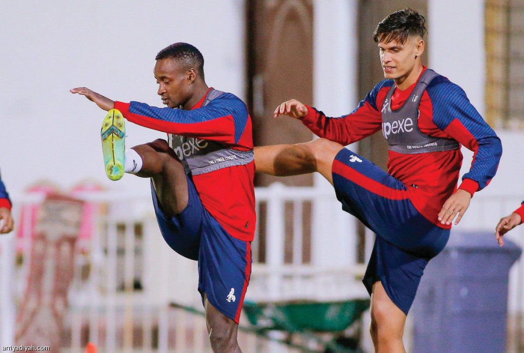 صورة التقطت أمس للبرازيلي نيلسون والمالي إبراهيما تانديا لاعبي فريق العدالة الأول لكرة القدم أثناء التدريبات استعدادًا لمواجهة هجر غدًا (المركز الإعلامي - العدالة)