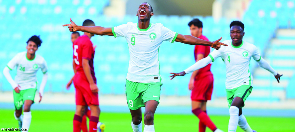 صورة التقطت أمس لعبد الله رديف، مهاجم المنتخب السعودي تحت 20 عامًا، يحتفل بأحد هدفيه في مرمى قطر (المركز الإعلامي ـ المنتخب السعودي)