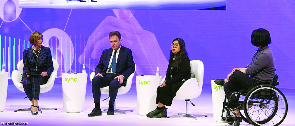 صورة التقطت أمس من الجلسة الحوارية الأولى التي ضمَّت عددًا من المتحدثين العالميين في قمة الاتزان الرقمي “سينك” (واس)